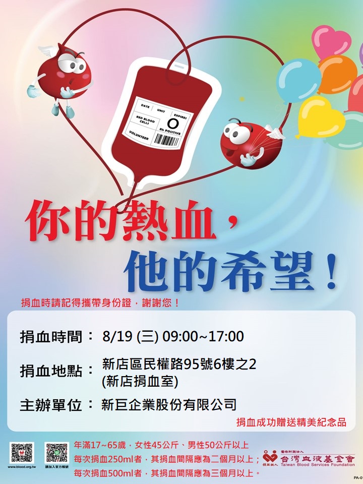連結你‧我‧他,挽袖做公益(捐血一袋、救人一命),邀請您一同響應,捐出您的熱血,讓熱血傳送你我的愛~